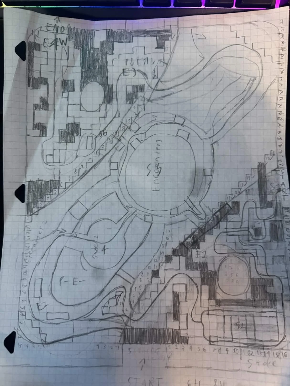 I blocked out the path the player takes and where each encounter will be, indicated by the large E’s scattered across the page.