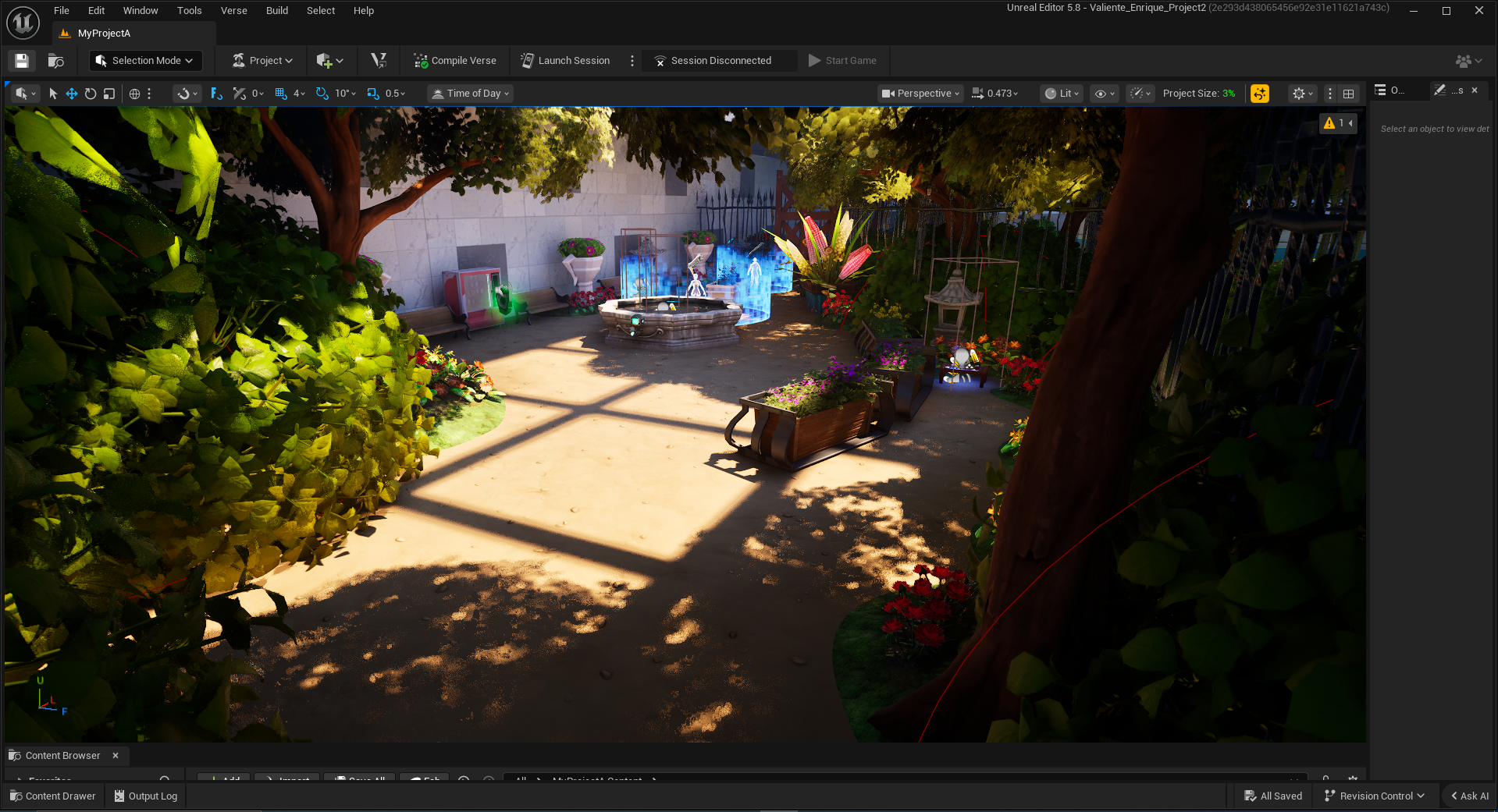 This would have been the glamour shot of the level—the fountain combat encounter. The original intention of this combat encounter was that the enemy faction would have set up two distinct buildings in this area, with the player having to make a full loop around the fountain to incapacitate each enemy.